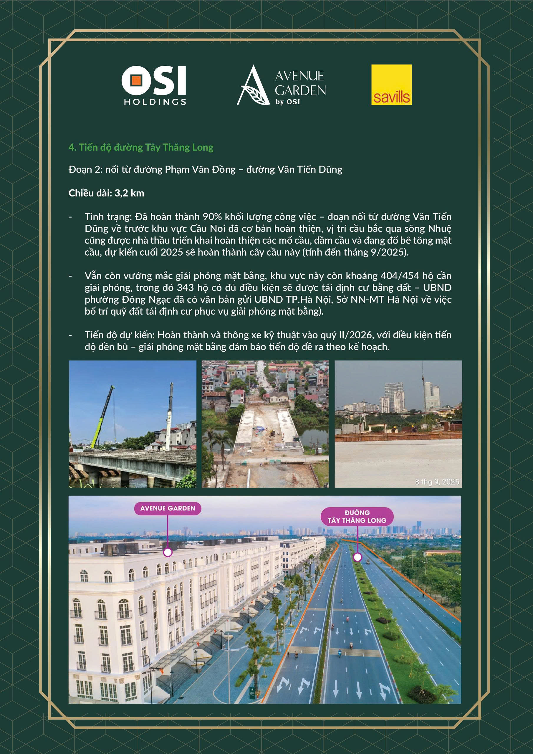 Tuyến Tây Thăng Long – huyết mạch kết nối Avenue Garden by OSI với trung tâm và các đại đô thị phía Tây – đã đạt ~90% khối lượng thi công; các mố cầu, dầm cầu ở khu vực Cầu Noi đang hoàn thiện, hứa hẹn “cởi trói” giao thông cho cả dải đô thị hai bên tuyến khi các vướng mắc mặt bằng được gỡ. Nhờ đó, cư dân và khách thuê tại Avenue Garden by OSI sẽ rút ngắn thời gian dịch chuyển tới những trạm “nam châm” mới của Tây Hà Nội.