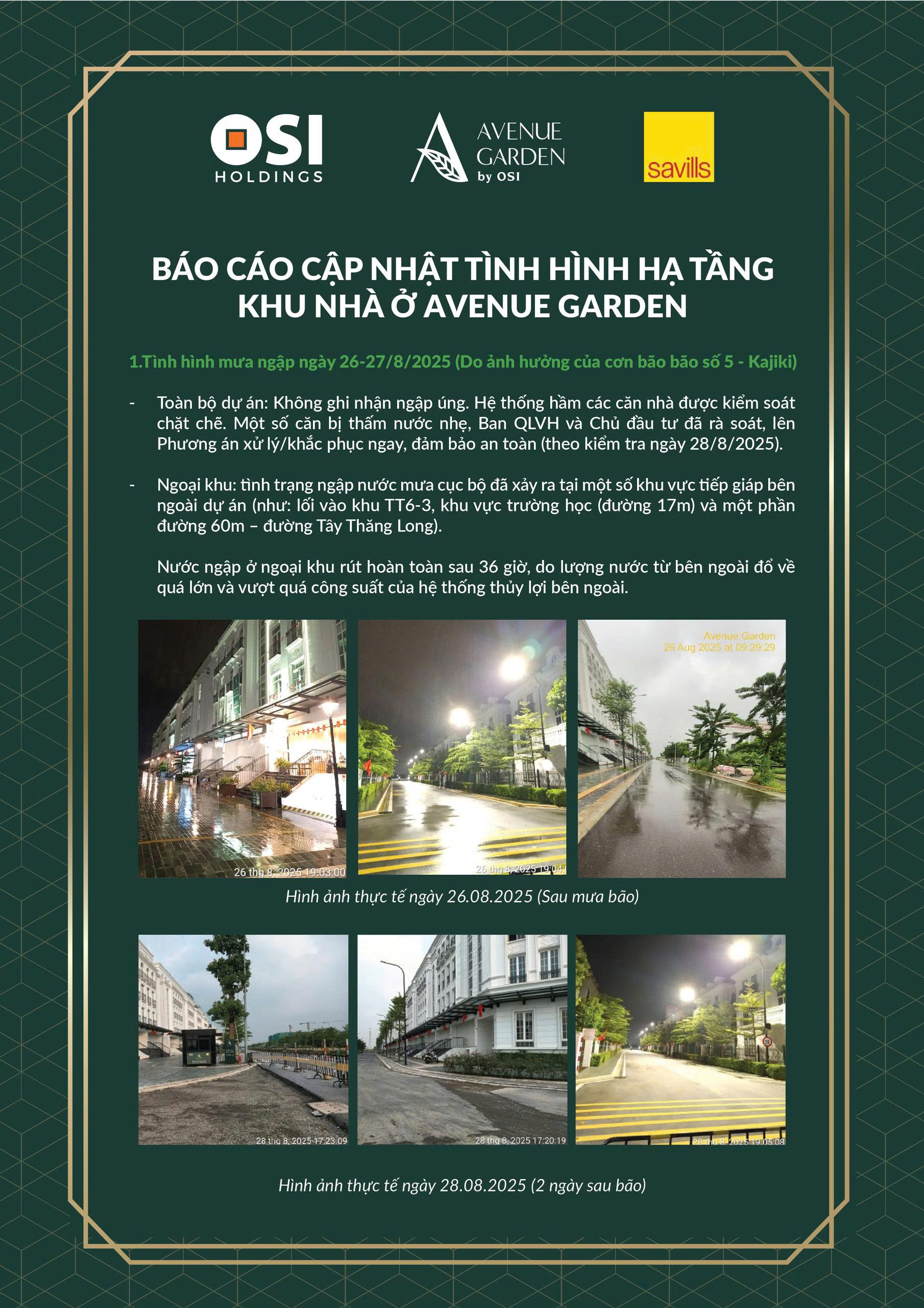 Những con số và hình ảnh hiện trường đã khẳng định Avenue Garden by OSI sở hữu một hệ thống hạ tầng được quy hoạch thông minh: từ mặt cắt đường, cao độ thoát nước đến các hầm kỹ thuật, kết hợp cùng sự vận hành chủ động, kiểm tra và gia cố trước bão, xử lý kịp thời ngay sau khi thời tiết cực đoan.