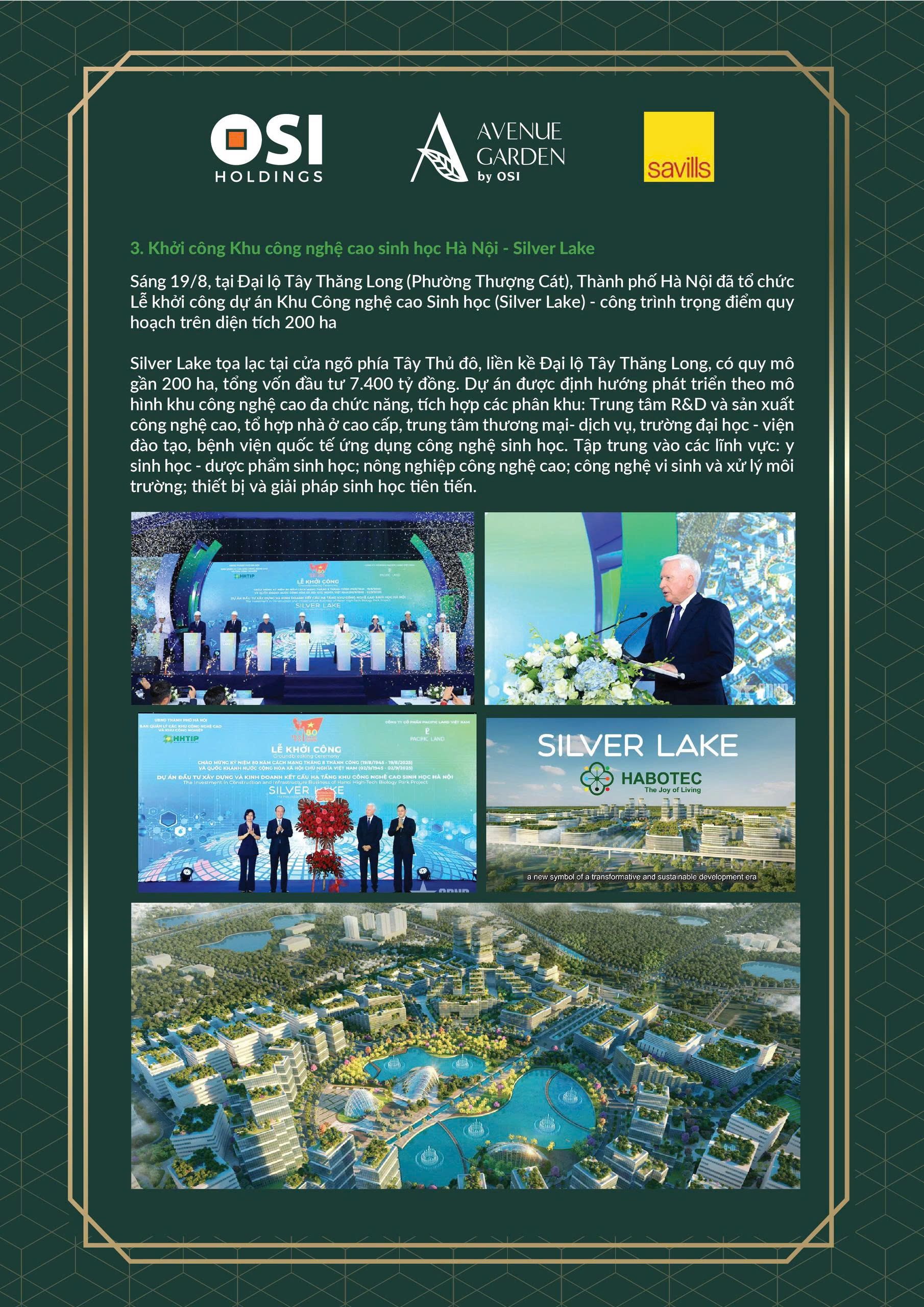 Sự kiện khởi công Khu công nghệ cao sinh học Hà Nội – Silver Lake tạo sức bật cho cả vùng: mô hình đa chức năng gồm trung tâm R&D – sản xuất công nghệ cao – thương mại – đại học – bệnh viện ứng dụng công nghệ sinh học… Việc hình thành một cụm “việc làm – dịch vụ – giáo dục – y tế” quy mô sẽ làm gia tăng nhu cầu nhà ở cho chuyên gia, dòng khách cho dịch vụ F&B – bán lẻ – chăm sóc sức khỏe quanh Avenue Garden by OSI.